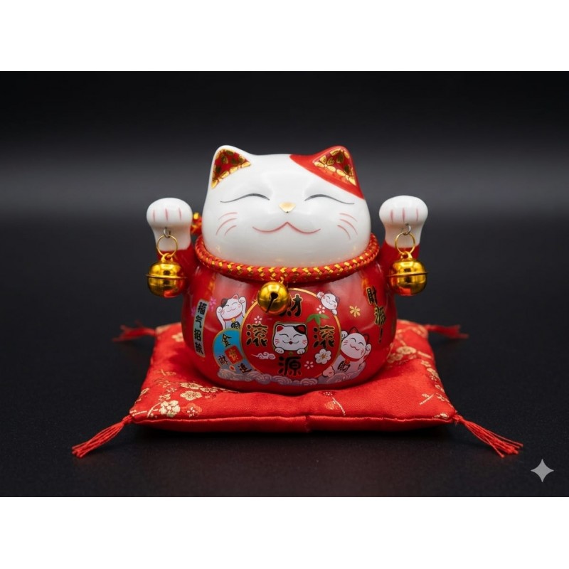 Crafted with a smooth ceramic finish and vibrant traditional red hues, this "Beckoning Cat" sits atop a premium silk-style cushion. Featuring both paws raised, it is traditionally believed to attract both customers and wealth, making it an ideal companion for business owners or a cheerful addition to your living room.
