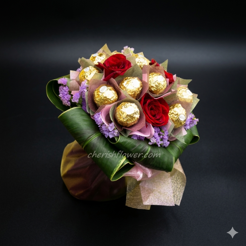 Our "Sweet Bites" is a combination of red roses and 9 pieces of Ferraro Rocher which concludes this beautiful chocolate hand bouquet!