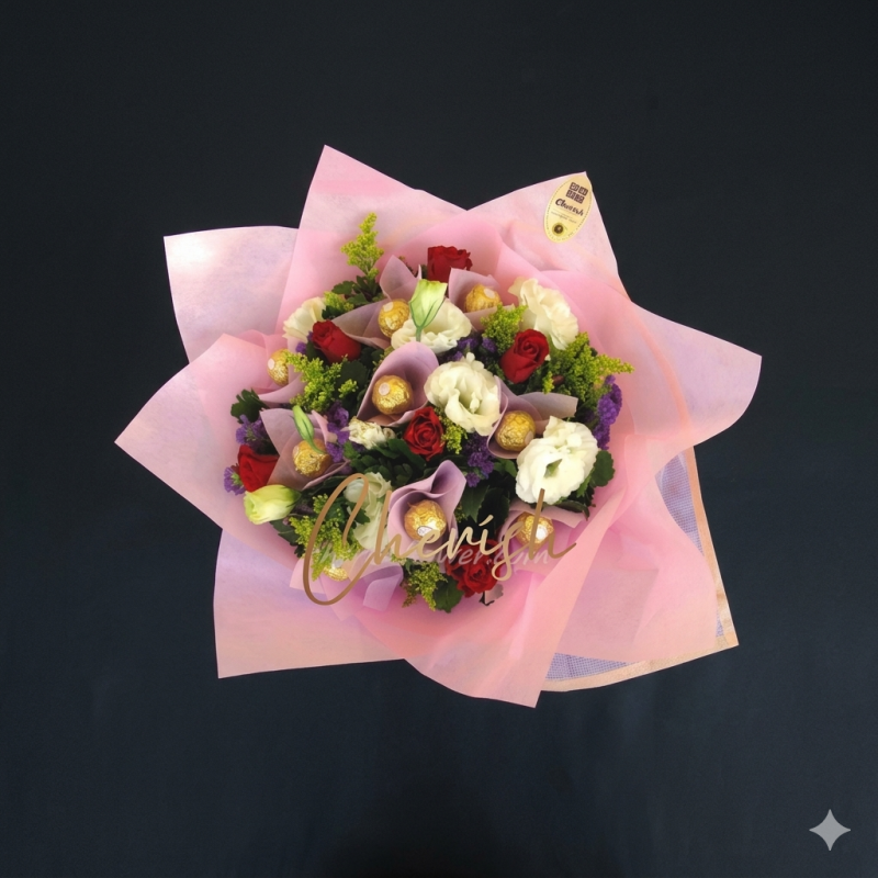 Combination of Red Roses and 9 pieces of Ferraro Rocher chocolates with colorful fillers to cheer someone up!