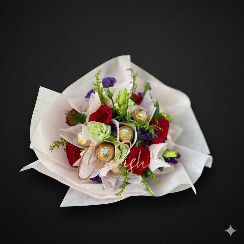 Our "Chocolate Bloom" has red roses and 9 pieces of Ferraro Rocher chocolate hand bouquet