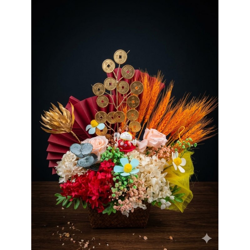 A true symbol of a "blessed harvest." The "Kemewahan Syawal" (Raya Luxury) basket is an opulent mix of golden-dusted wheat, vibrant red hydrangeas, and soft peach roses. Adorned with a tree of golden coins and a festive lucky cat, this arrangement is designed to invite wealth and happiness into any home. It is a stunning, multicultural masterpiece that celebrates the rich diversity and shared joy of the season.