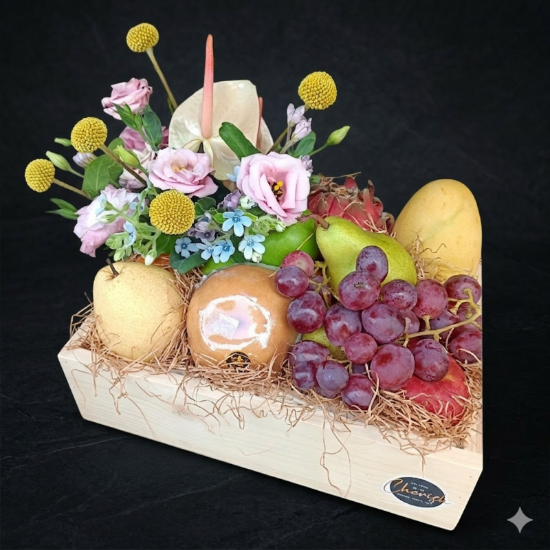 This Cherish Wood Crate comes together with a vibrant mix of fresh fruits and imported flowers, a delightful combo for that special someone.
