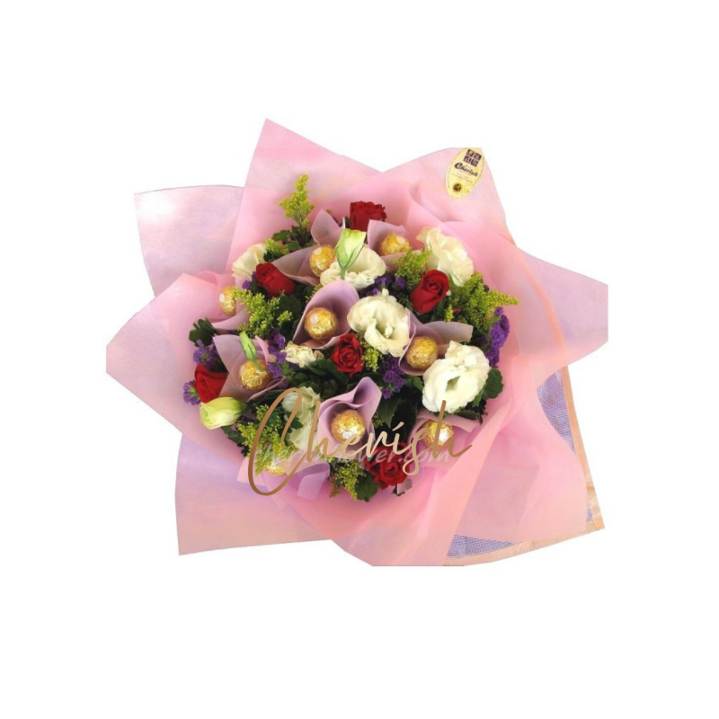 A combination of Red Roses, White Eustomas & matching fillers with 8 pcs of Ferrero Rocher chocolate.