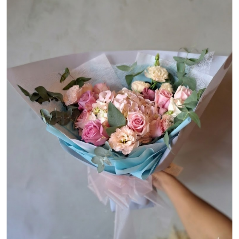 A breath of fresh air for the woman who inspires you. This stunning bouquet is a masterclass in soft contrasts. Featuring a cloud of pastel pink hydrangeas and premium blush roses, it is elegantly framed by silvery Eucalyptus leaves that provide a modern, aromatic touch.