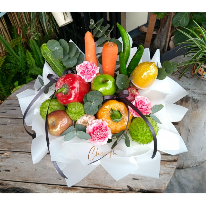 This stunning 'edible' arrangement features a vibrant mix of fresh bell peppers, carrots, apples, and lemons, beautifully accented with delicate pink carnations and silver dollar eucalyptus.