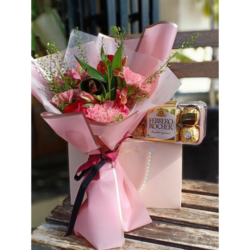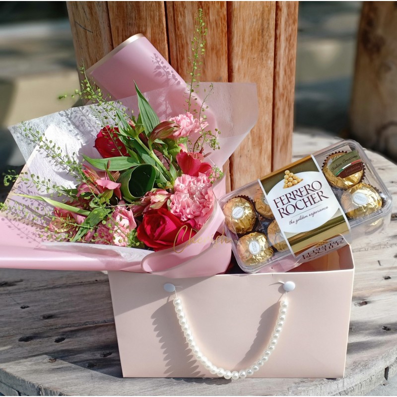 Make Mother’s Day sweet with our Pink Carnation Bouquet and Ferrero Rocher gift set. This elegant floral bundle includes a luxury pearl-handle gift bag with premium chocolates.