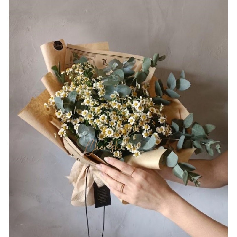This arrangement features a lush cluster of miniature chamomile flowers, known for their sweet, apple-like scent and association with "energy in adversity". These cheerful blooms are elegantly paired with silver-toned eucalyptus branches.