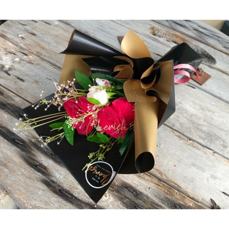 "A sophisticated blend of premium red roses and delicate accent fillers, professionally hand-wrapped in a duo-tone black and gold craft paper.